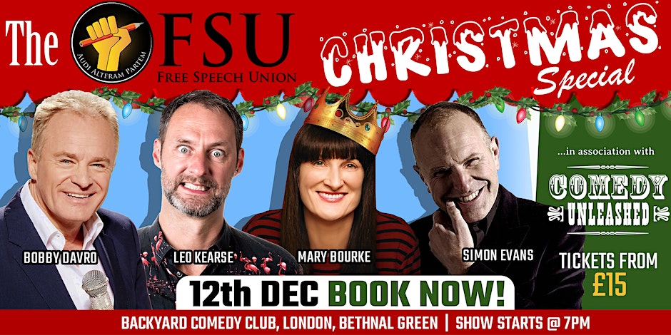 Comedy legend Bobby Davro is our Master of Ceremonies for the evening. Amazing! Bobby will be joined on stage by stand-up comedian and GB News presenter Leo Kearse, Comedy Unleashed favourite Mary Bourke and comedian and presenter Simon Evans.