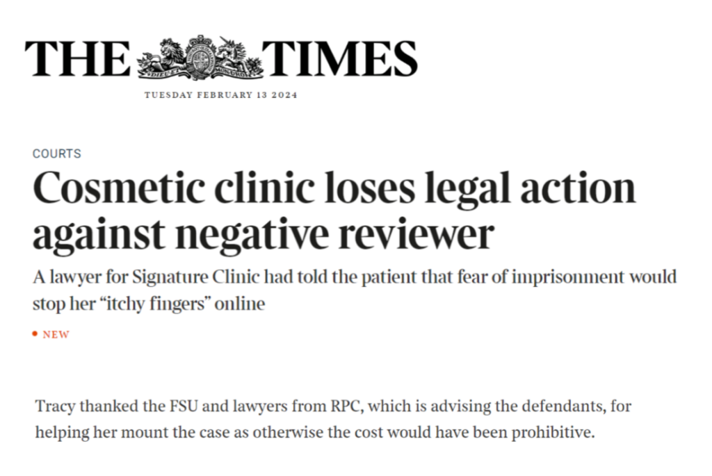 Speaking to the Times, Bryn Harris, the FSU’s chief counsel, said that the judge’s decision was “a very welcome vindication of our member’s right to freedom of speech”, adding: “This decision sends a very clear message to Signature Clinics, and all other litigants, that abusing the legal process to threaten customers into silence is wholly unacceptable. We hope the Solicitors Regulation Authority hears that message loud and clear.”