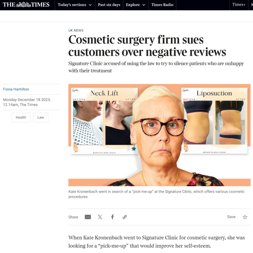 The FSU has been assisting a group of six people, including Tracy, who have been hit with legal claims from one of the UK’s largest cosmetic surgery chains, Signature Clinics, after independently posting honest but unfavourable comments about the company on various online support groups and review sites. Four of the six are facing defamation proceedings, and all have similar stories, while Tracy and another person have been accused of harassment. All but one of the group are former patients. (Our involvement in this case was first reported in the Mail, Times and on Times Radio.)