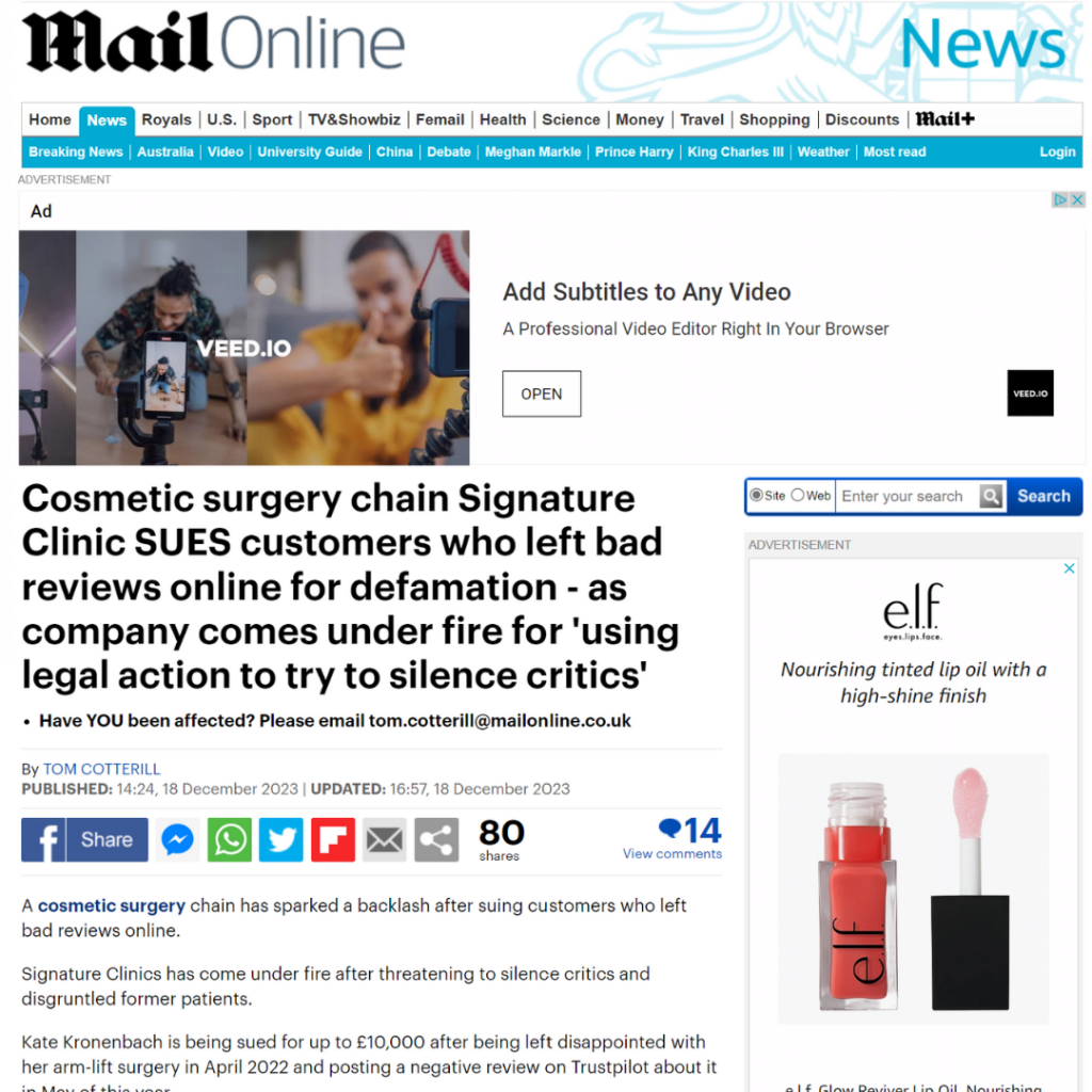 In recent years, SLAPPs have become notorious after a series of actions against journalists designed to stifle free speech and suppress legitimate reporting. Worryingly, however, Signature Clinic’s use of lawsuits appear to be the first major attempt to use this mechanism to silence consumers who place unflattering reviews online.