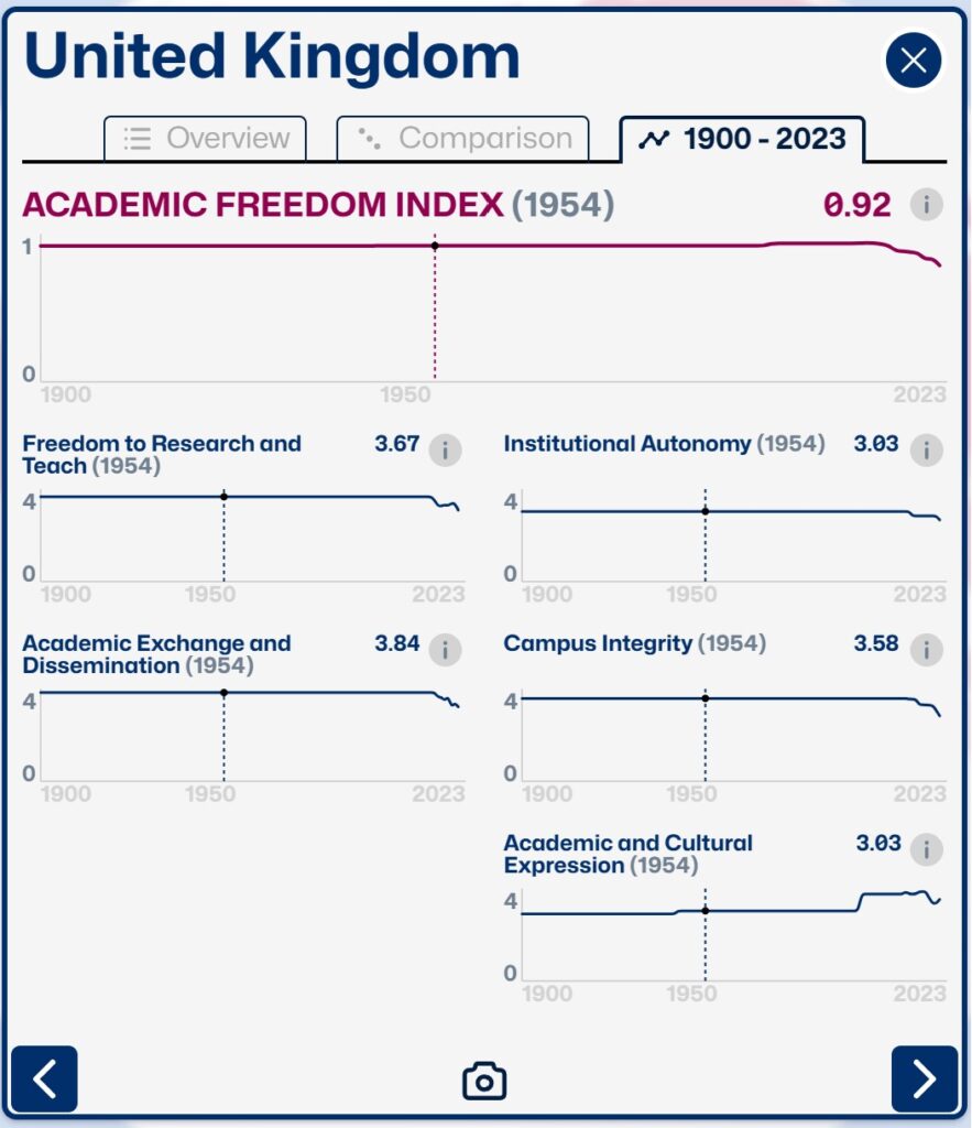 This dip in the UK’s index score is due to a decline across each of the AFI’s five separate indicators, with the sharpest falls coming in relation to ‘academic exchange and dissemination’ – down from 3.84 in 2015 to 3.22 in 2023 (–16% per cent) – and ‘campus integrity’ – down from 3.58 to just 2.81 (–21% per cent).